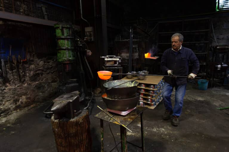 Uno straordinario sovvertimento di significato che riconverte un simbolo di guerra in un artefatto gentile. Il processo produttivo contiene a sua volta un passaggio di senso, dalla forza alla gentilezza: il ferro, tornito con energia potente e poi passato nel fuoco per l’ultimo trattamento con la cera, diviene un poetico oggetto per contenere, come dice il suo autore, “le cose della vita”.